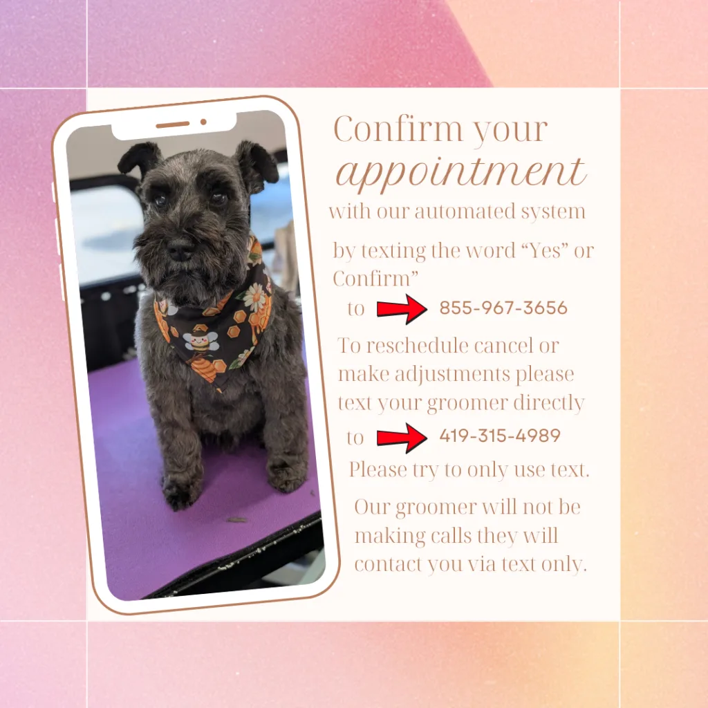 We will not arrive to unconfirmed Grooming appointments. You receive a reminder text that you need to reply yes to confirm: 5-days in advance to your appointment or 2-days prior to your grooming appointment. No last min confirmations. All grooming appointments need to be confirmed by 4pm after the 2-day reminder is sent. A fee will be applied to the next grooming appointment automatically and CANCELLED by our automated system. Any habitual offenders will not be able to use Vroom Grooms LLC. Please take the time to read over any information that you receive from Vroom Grooms LLC. That includes visiting vroomgrooms.com when you create a grooming appointment to read our terms and conditions.