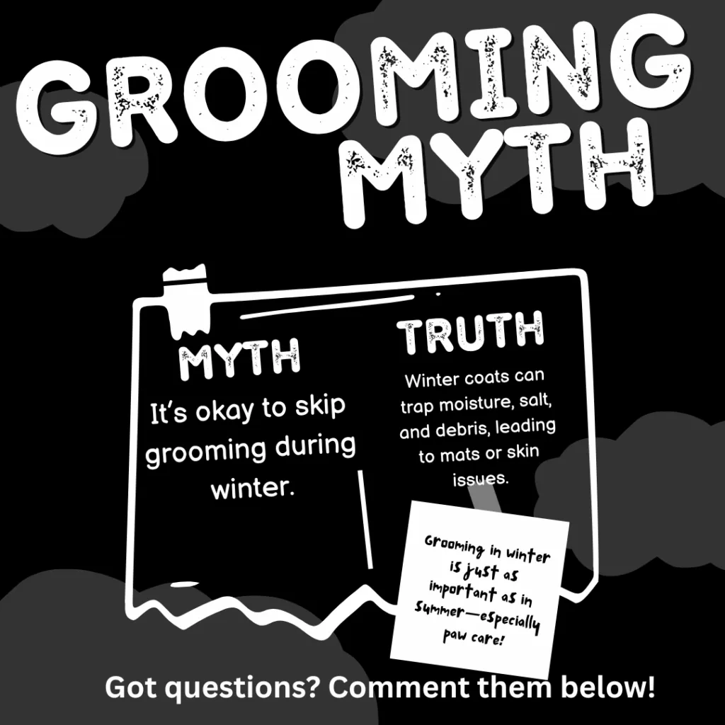 ✅ Truth: Winter coats can trap moisture, salt, and debris, leading to mats or skin issues. Grooming in winter is just as important as in summer—especially paw care!