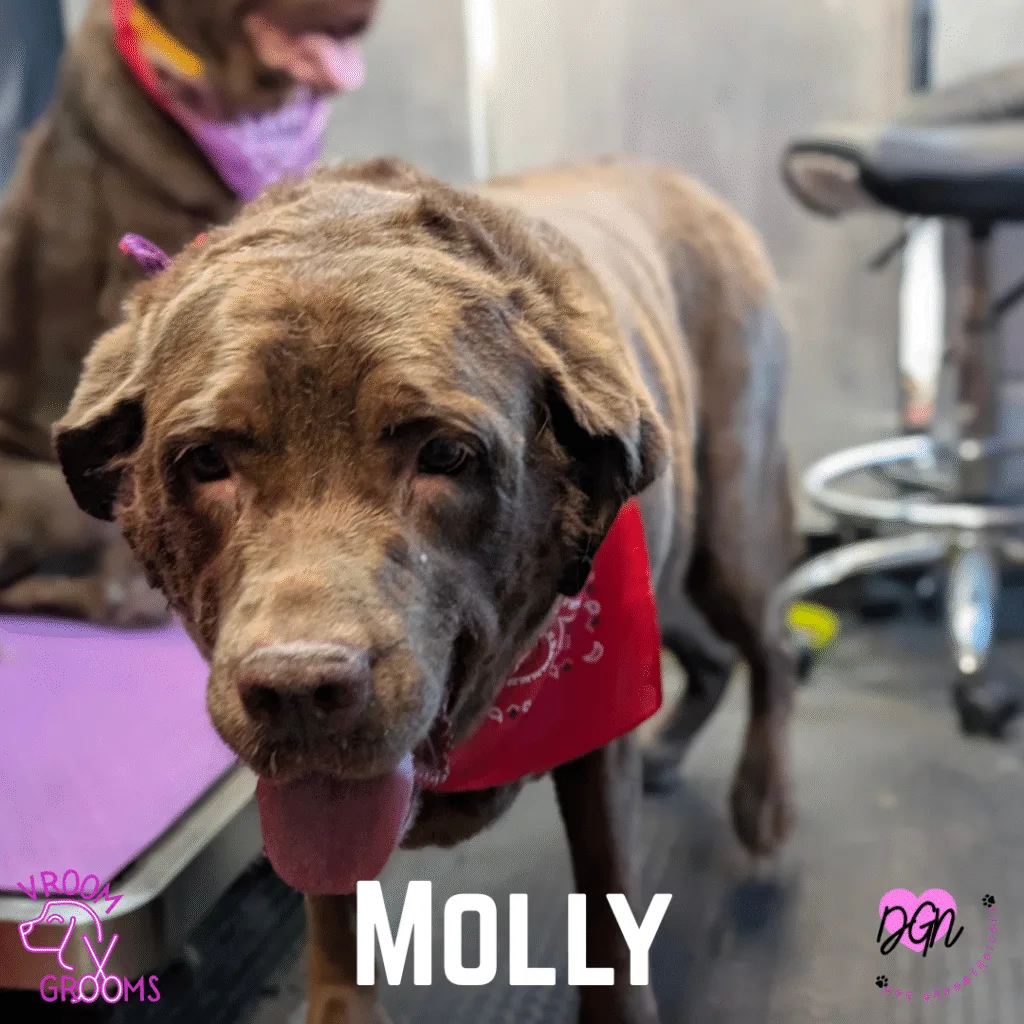 Molly is a mastiff-lab mix with a heart as big as her paws. She’s the kind of dog who greets you with a full-body wag and a generous helping of drool—her signature love language. Whether she’s lounging like royalty or lumbering over for a cuddle, Molly’s presence is pure comfort. Her drool may require a towel or two, but it’s a small price to pay for the joy she brings.