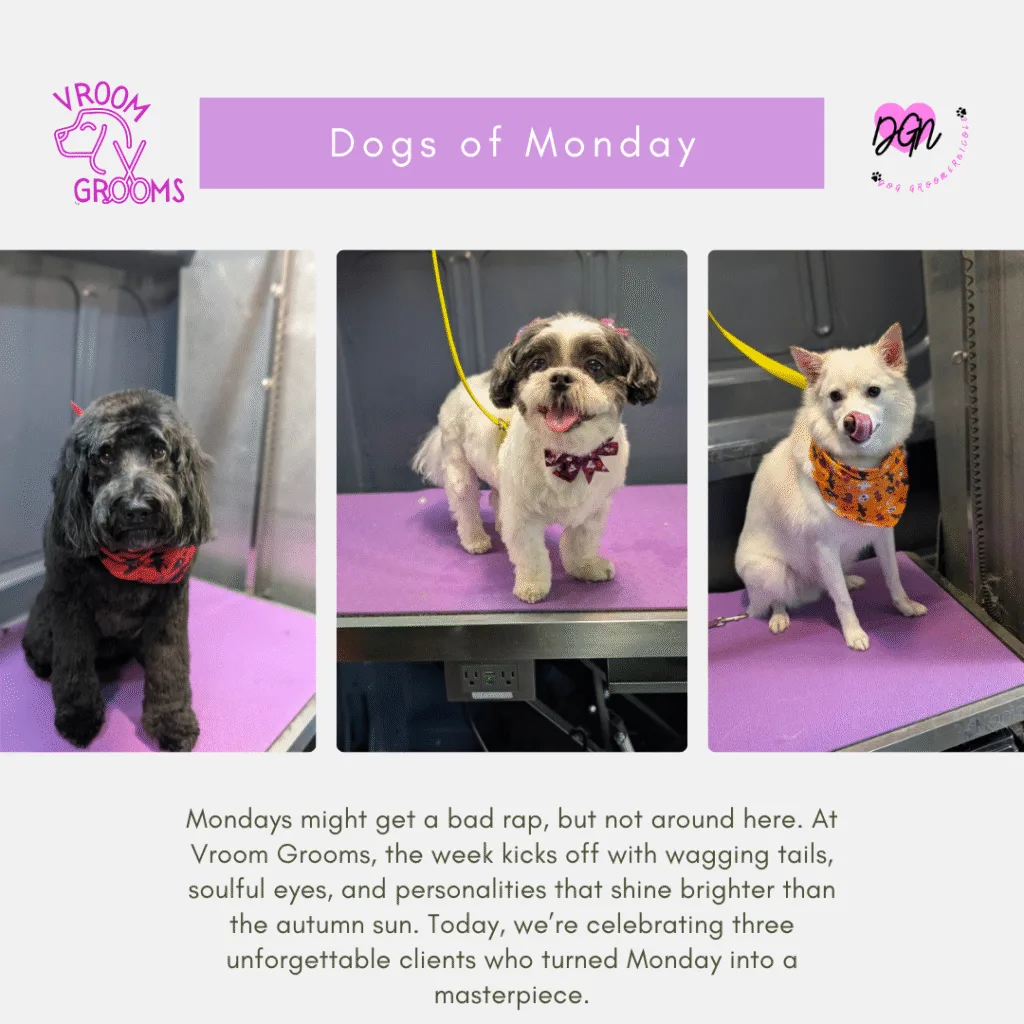 Mondays might get a bad rap, but not around here. At Vroom Grooms, the week kicks off with wagging tails, soulful eyes, and personalities that shine brighter than the autumn sun. Today, we’re celebrating three unforgettable clients who turned Monday into a masterpiece.