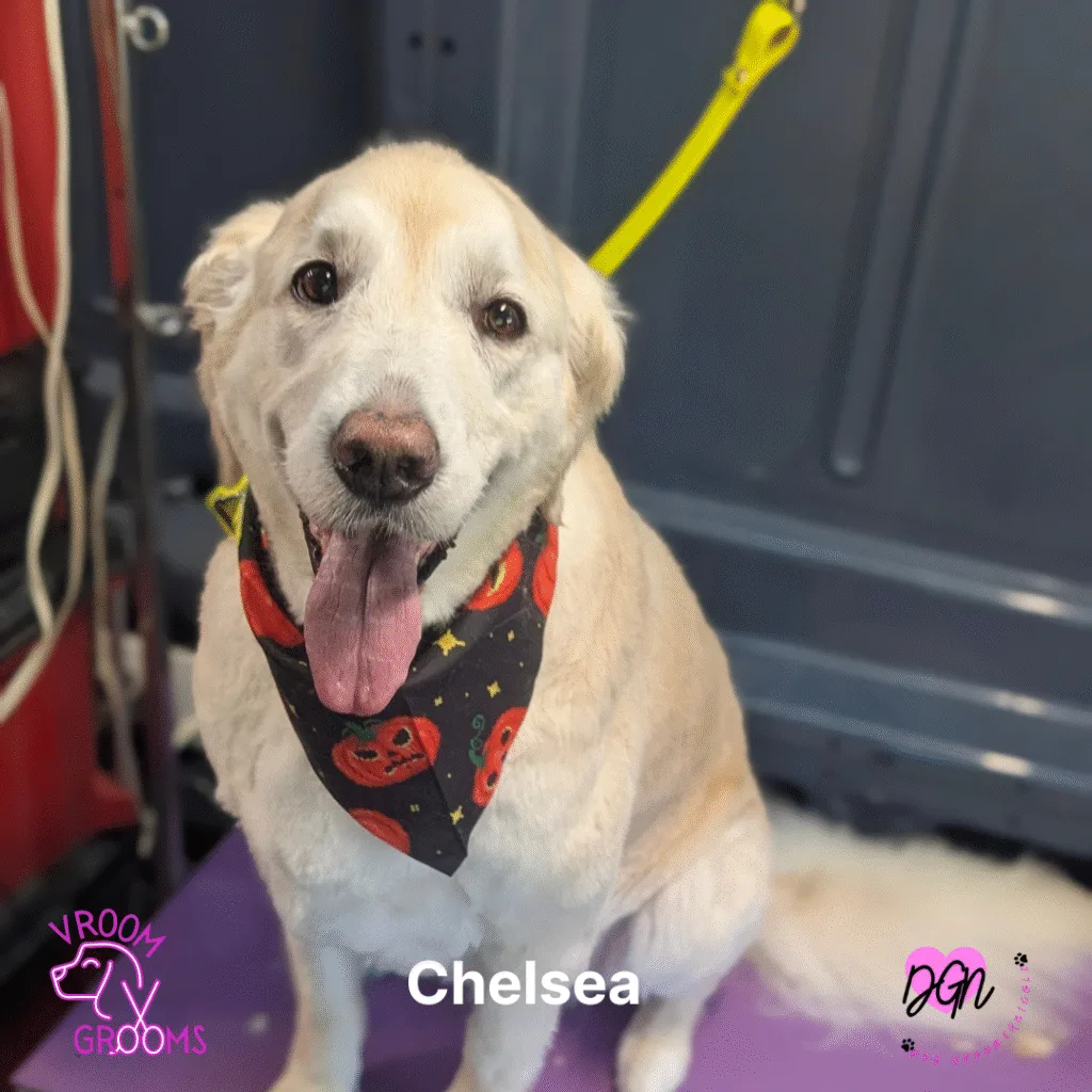 Chelsea is a golden retriever with a golden soul. She’s a senior sweetheart who’s been through many grooming days, and she still lights up when she sees her groomer — tail wagging, eyes soft with recognition.