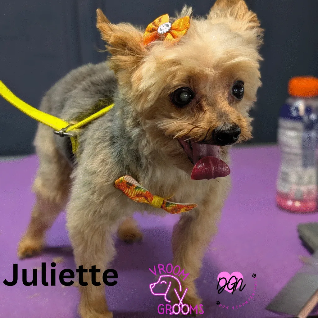 • Juliette, his elegant Yorkie counterpart, is pure grace. With her silky coat and confident sparkle, she’s the kind of pretty lady who knows her angles and owns her moment.