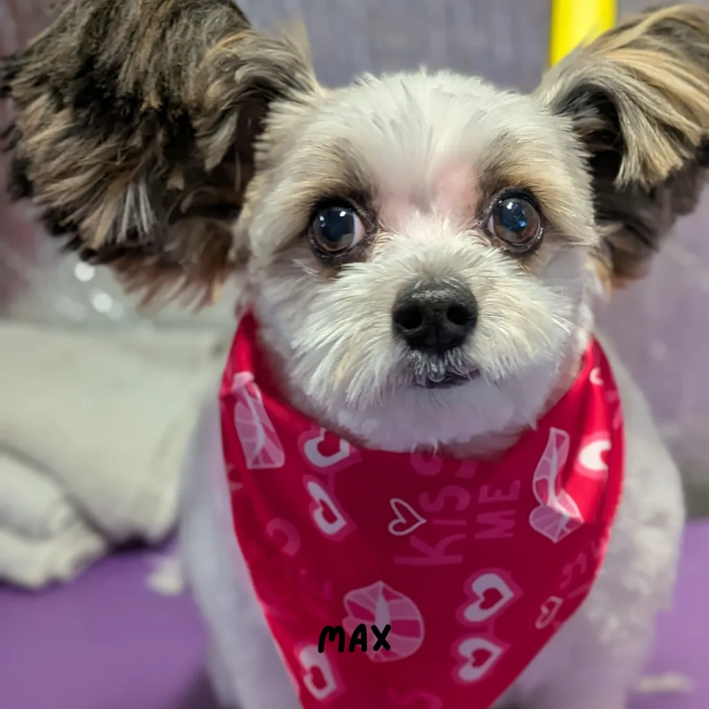 Next we have Max, the Papillon mix who is, quite literally, all ears. His expressive little face and those iconic ears make him a total showstopper. Max has this way of looking at you like he’s listening to every word, every sound, every thought. He’s a character, for sure, and he brings such a fun, bright energy to the grooming table.