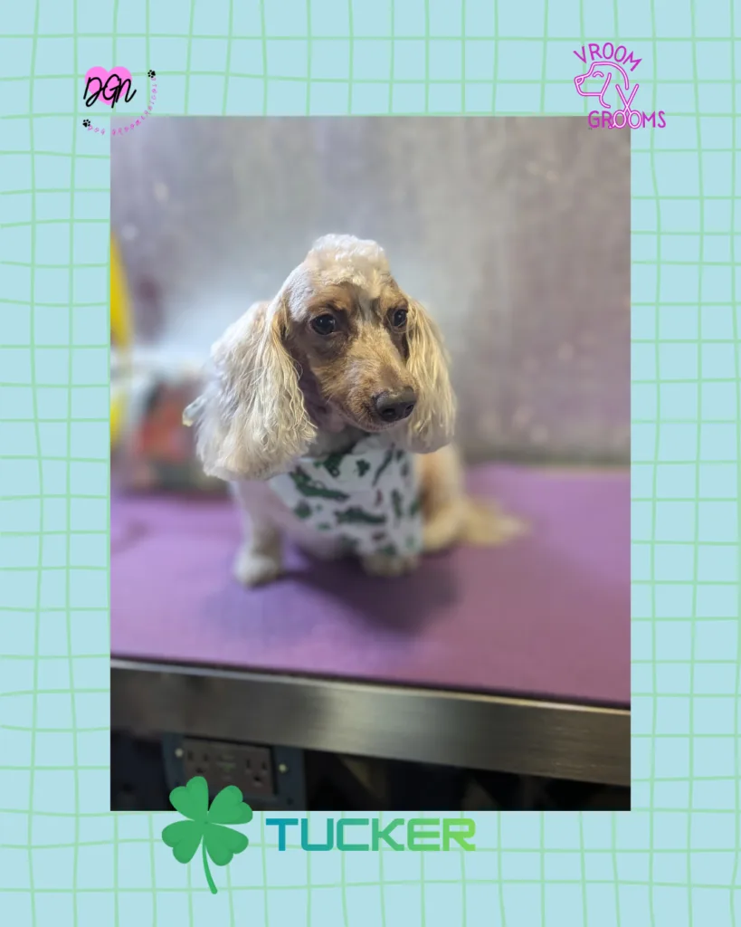 Tucker, our adorable little weeny dog, came in ready to win hearts… and perform approximately 47 nervous spins on the grooming table. Every single one just made him more lovable. He’s tiny, he’s wiggly, he’s precious, and the whole van fell in love with him all over again.