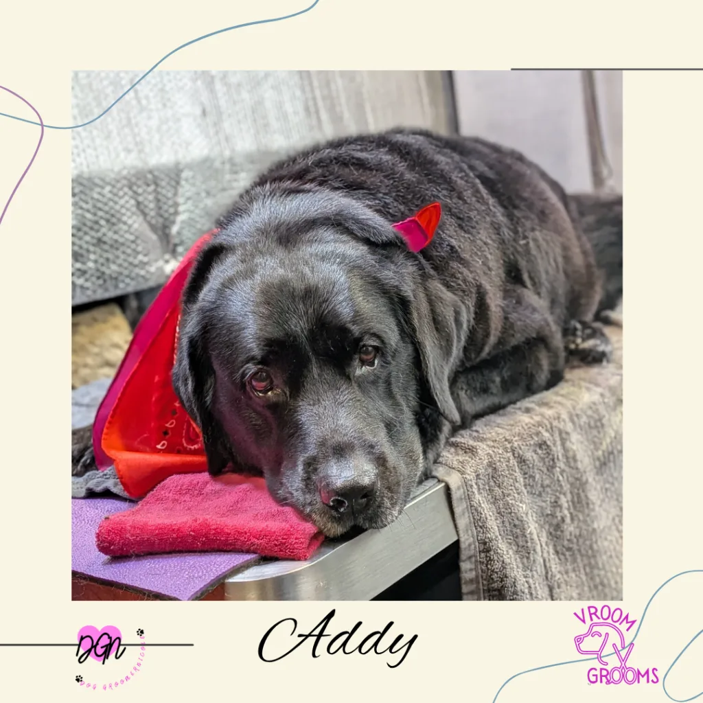 Addy’s coat is so dark and glossy it practically glows under the grooming lights. She’s a water lover through and through, so bath time is basically her favorite part of the day. Tail wagging, eyes bright, fully living her best spa‑day life — Addy is the definition of joyful simplicity.